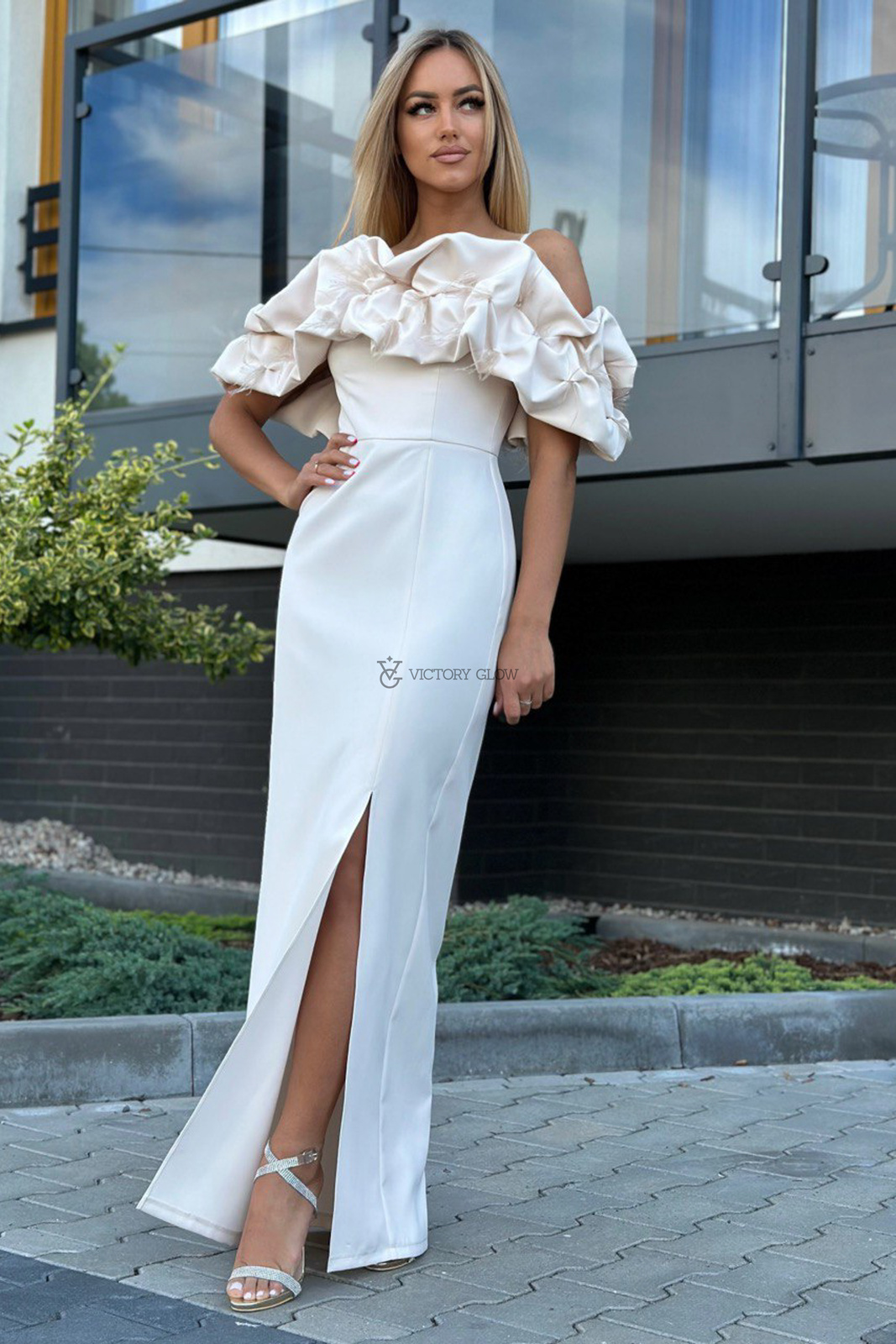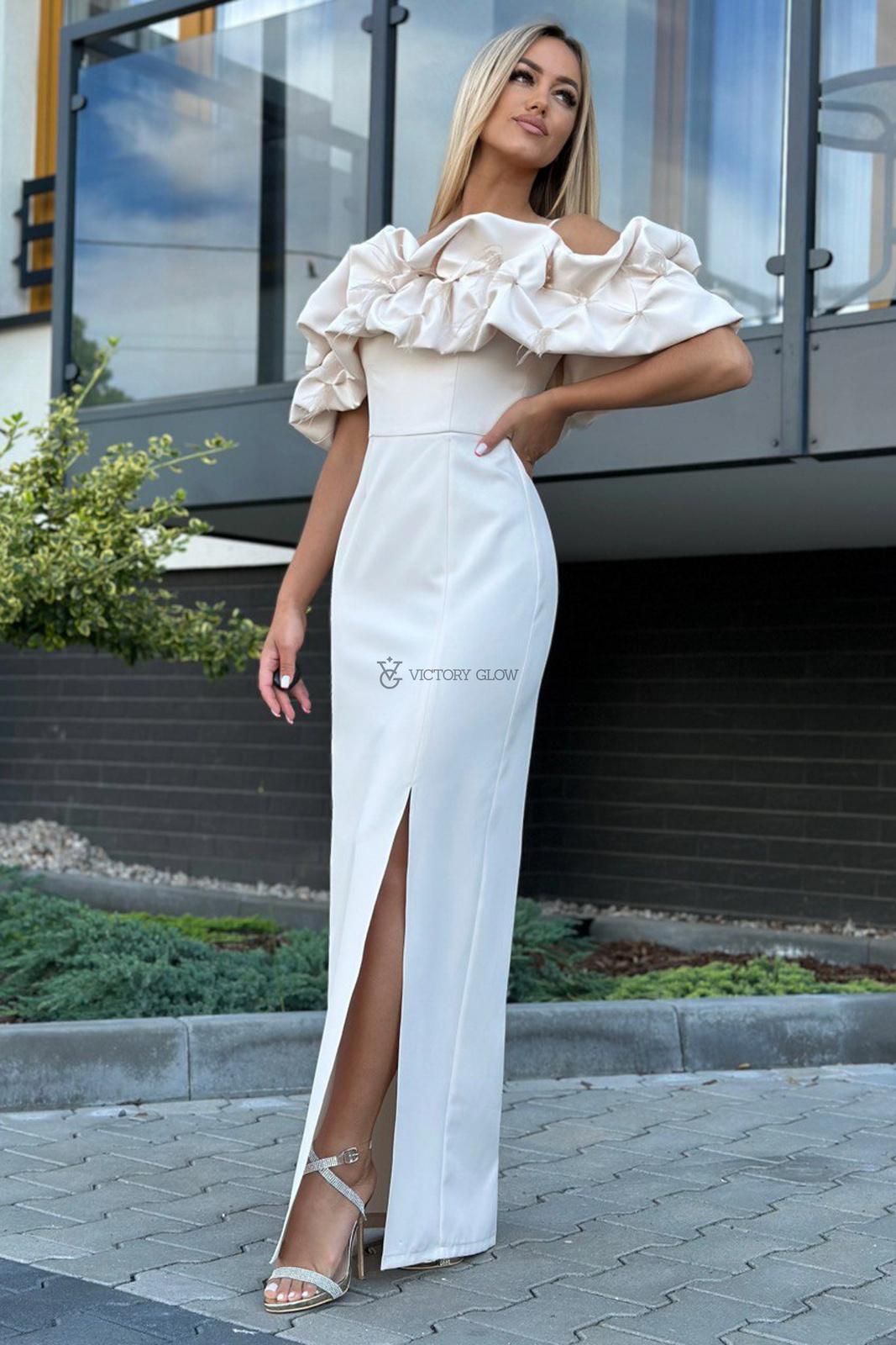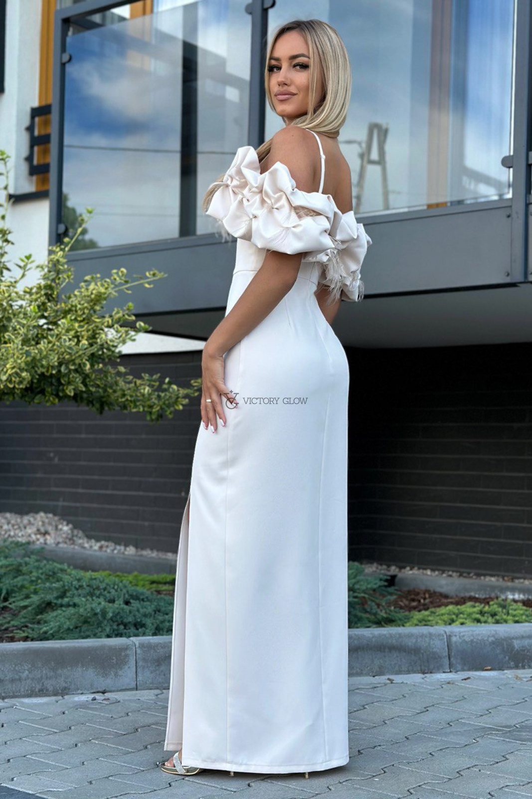 Model w długości maxi pięknie podkreśla sylwetkę i nadaje się idealnie na wyjątkowe okazje. Subtelne cienkie ramiączka dodają lekkości, a efektowne bufiaste rękawy nadają całości wyjątkowego charakteru.