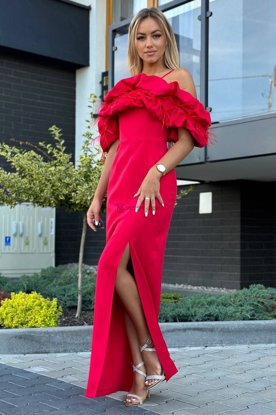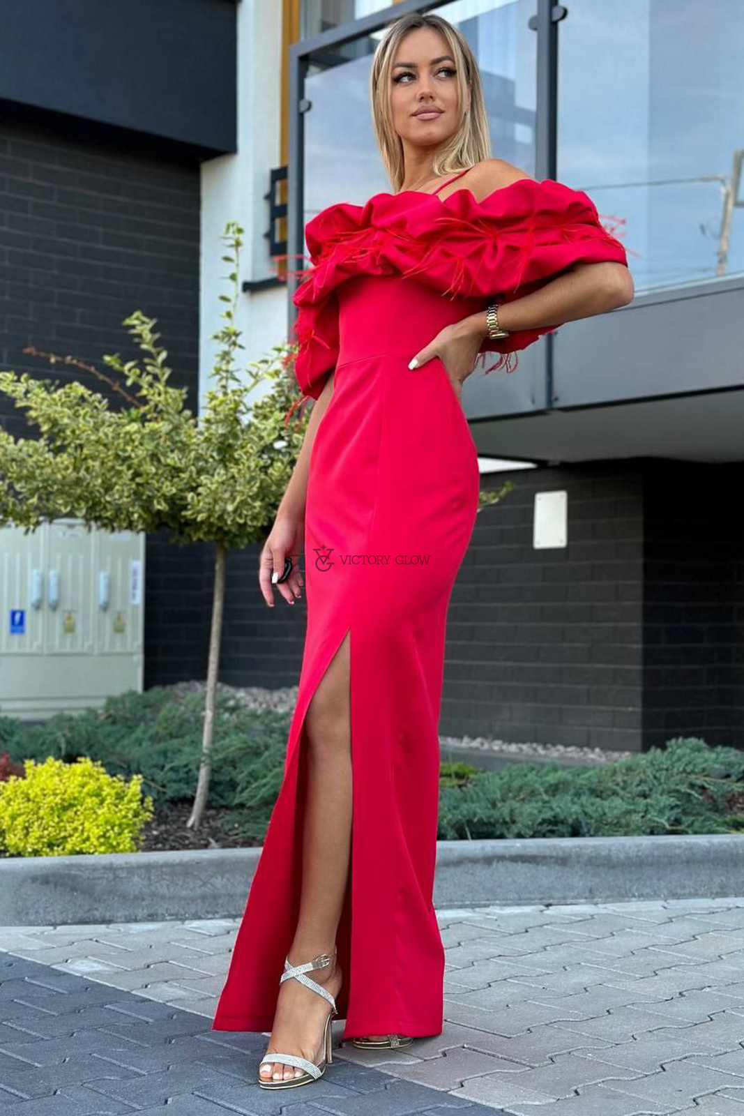 Model w długości maxi pięknie podkreśla sylwetkę i nadaje się idealnie na wyjątkowe okazje. Subtelne cienkie ramiączka dodają lekkości, a efektowne bufiaste rękawy nadają całości wyjątkowego charakteru.