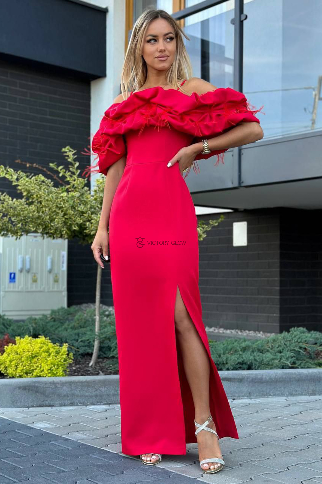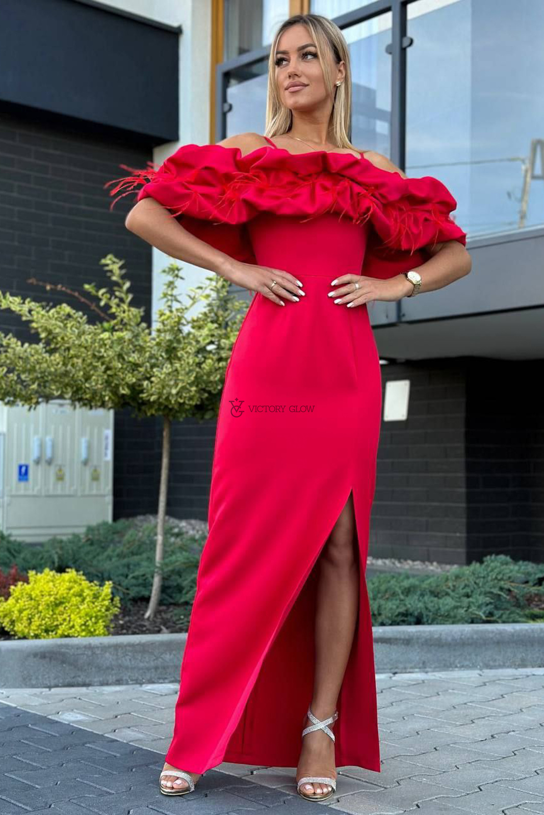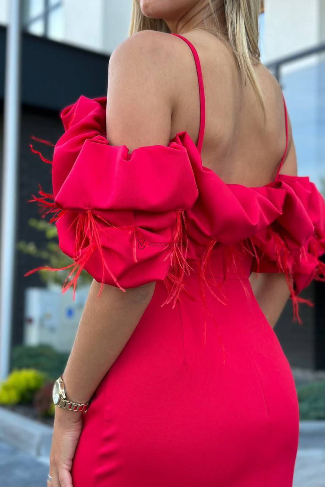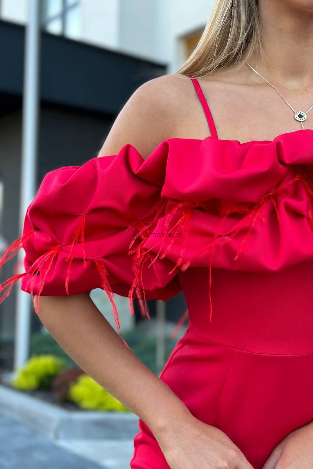 Delikatne zdobienia z naturalnych piór przy dekolcie i rękawach sprawiają, że sukienka prezentuje się niezwykle luksusowo i przyciąga spojrzenia. Model zapinany z tyłu na dyskretny suwak, co zapewnia komfort noszenia i doskonałe dopasowanie.