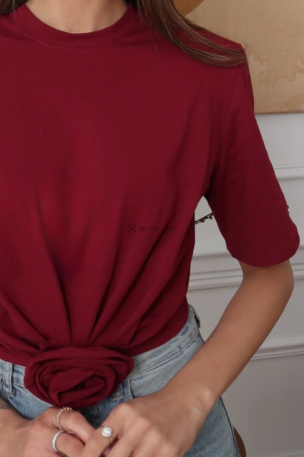 T-shirt Betti z różą w talii bordo