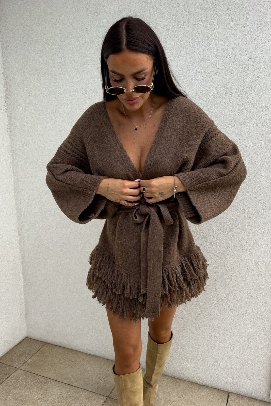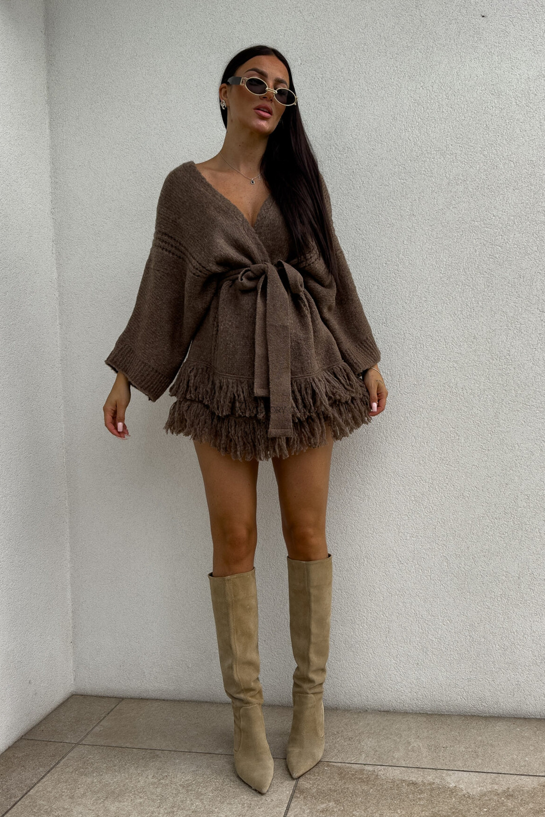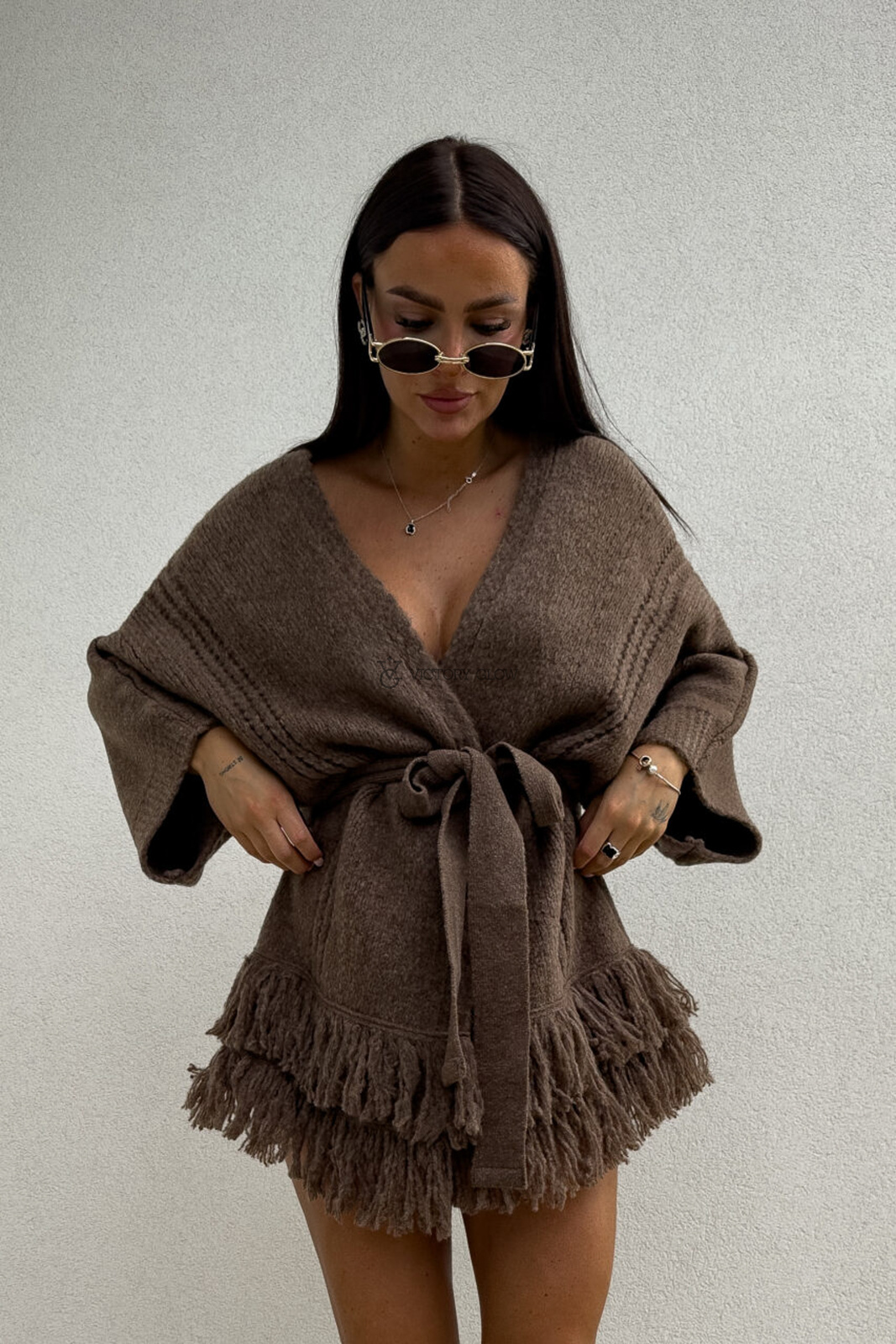 Wełniany kardigan boho z paskiem Oriana czekoladowy